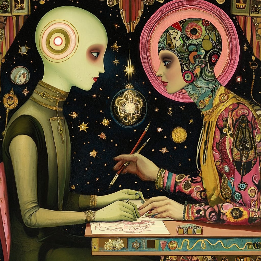 The intersection of human creativity and artificial intelligence opens up speculative futures where the boundaries of art and authorship are fundamentally redefined. One of the most compelling scenarios is that of collaborative creativity, where humans and AI co-create, leading to entirely new hybrid art forms. Artists are already experimenting with AI as a creative partner - feeding algorithms with data, interpreting AI-generated suggestions, and responding to them with their own interventions. In visual arts, artists like Sougwen Chung have collaborated with robotic systems to co-create intricate drawings, blending the unpredictability of human gesture with the precision of machine-generated patterns. In music and performance, AI systems are beginning to adapt to audience reactions in real-time, contributing to dynamic, interactive experiences. These collaborations suggest a future where the creative process becomes less about solitary genius and more about dialogic interaction - between human intuition and machine analysis, chaos and logic, randomness and design.